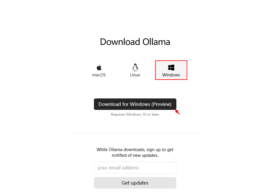 访问 https://ollama.com/download,选择 Windows,单击 “Download for Windows (Preview)” 进行下载。