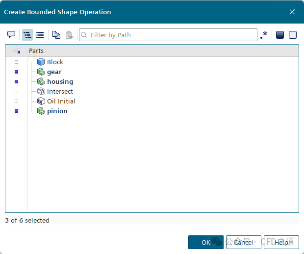 在Create Bounded Shapte Operation对话框中,选择 housing,gear,和 pinion,然后点击 OK。