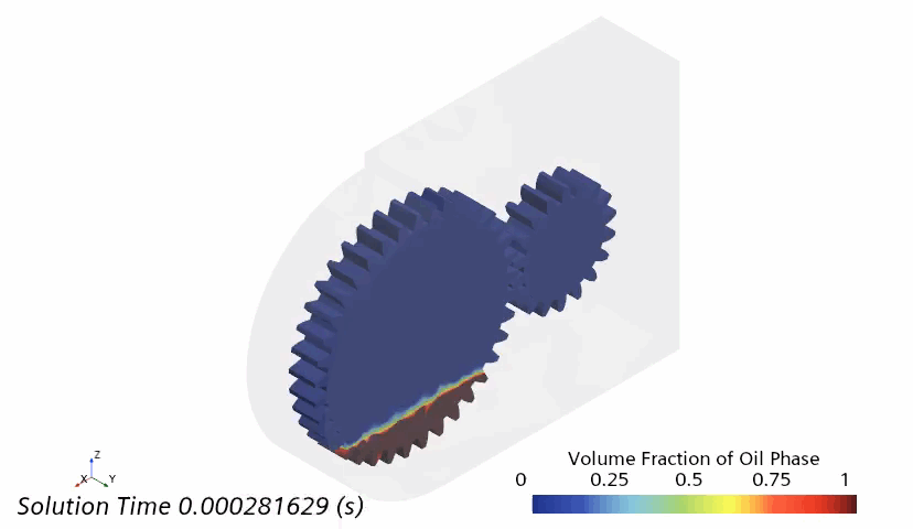 仿真开始时,腔体内的油位高度为0.02米。油被模拟为不可压缩液体,其密度为845.1 kg/m³,动力粘度为0.074 Pa.s。采用固定大小的颗粒离散化油液,其颗粒直径为1毫米。通过对齿轮表面区域内的齿轮部件应用直接旋转运动值来规定齿轮的旋转。案例使用自适应时间步长方法,根据网格尺寸和计算速度动态调整时间步长大小。仿真计算时间为0.5秒。
