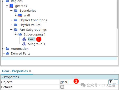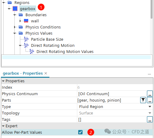 选择Regions > gearbox节点,并启用Allow Per-Part Values选项,允许对单个部件设定值。