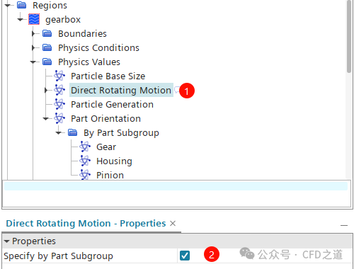 选择 Regions > gearbox > Physics Values > Direct Rotating Motion 节点并激活 Specify by Part Subgroup。