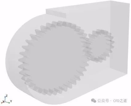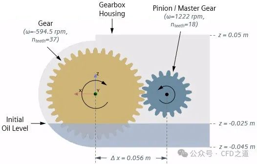 此齿轮箱为封闭系统,内部不存在流动边界。啮合的齿轮置于油浴中并以高速反向旋转。小齿轮转速为1222 rpm,大齿轮转速为-594.5 rpm。
