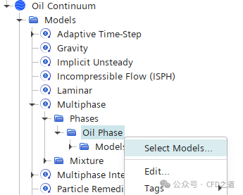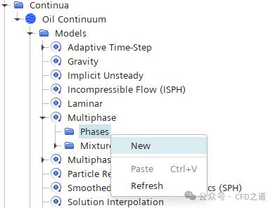 右键点击Continua > Oil Continuum > Models > Multiphase > Phases节点并选择New创建新节点,将新节点重命名为Oil Phase。