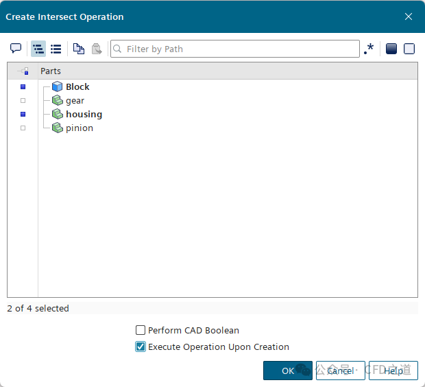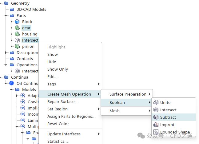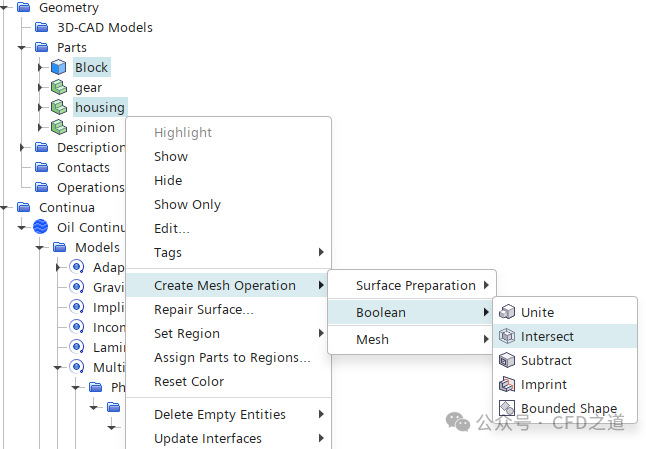 多选 Parts > Block 和 housing 节点,右键单击其中一个选定的节点,并选择 Create Mesh Operation > Boolean > Intersect。