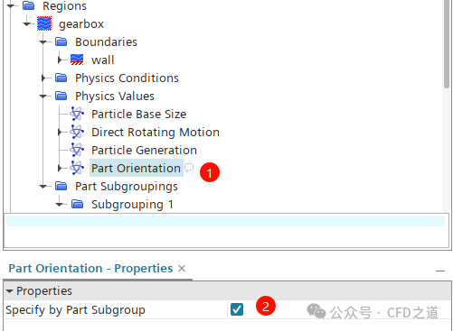 选择gearbox > Physics Values > Part Orientation节点,并激活Specify by Part Subgroup选项,开始按部件子组指定法线方向。