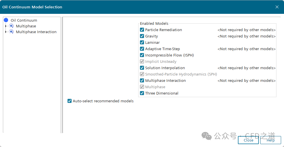 右键点击 Continua > Oil Continuum 节点并选择 Select Models... ,在弹出的对话框中按顺序选择以下模型