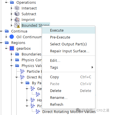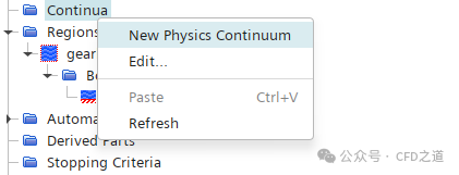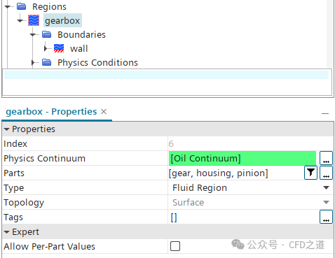 选中 Regions > gearbox 节点,并将 Physics Continuum 设置为 Oil Continuum。