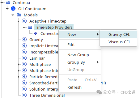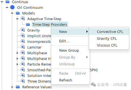 右击 Continua > Oil Continuum > Models > Adaptive Time-Step > Time-Step Providers 节点,选择 New > Convective CFL。