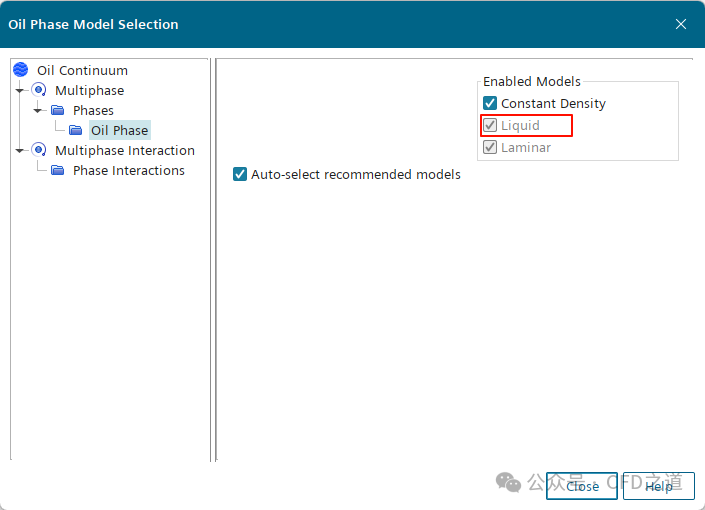 在Oil Phase Model Selection对话框中,在Materials组框内选择Liquid,然后点击Close。