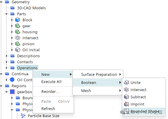 右键单击 Geometry > Parts > Operations 节点并选择 New > Boolean > Bounded Shape。