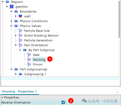 为了确保流体颗粒仅在边界条件的内侧考虑封闭表面(如齿轮箱壳体)上的边界条件,需要调整该表面的法线方向,使其正向朝向内侧。为此,需要对包含壳体的部件反向设置面法线的方向。