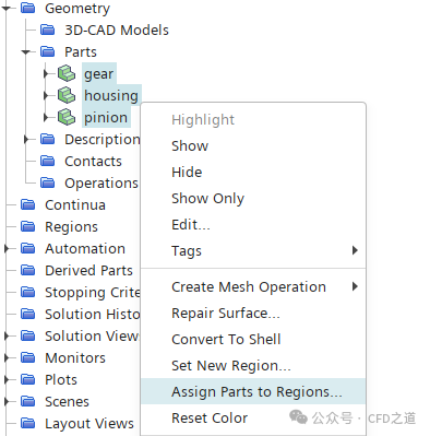 同时选中 Geometry > Parts 节点下的housing、gear 和 pinion 节点,右键单击其中一个选定节点,然后选择 **Assign Parts to Regions...**。