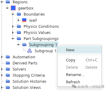右键选择Part Subgroupings > Subgrouping 1 > Subgroup 1节点。然后选择New,以创建一个新的子组。