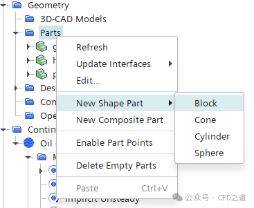 右键单击 Geometry > Parts 节点并选择 New Shape Part > Block。