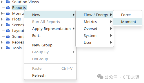 右击 Reports 节点并选择 New > Flow / Energy > Moment。将 Moment 1 节点重命名为 Gear Torque。