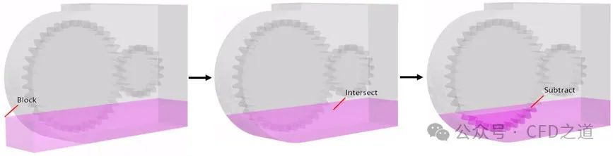 首先从一个与齿轮箱对齐的长方体开始,并将其高度设置为油的初始高度。接着用这个长方体与齿轮箱进行相交操作。从相交部分减去齿轮。