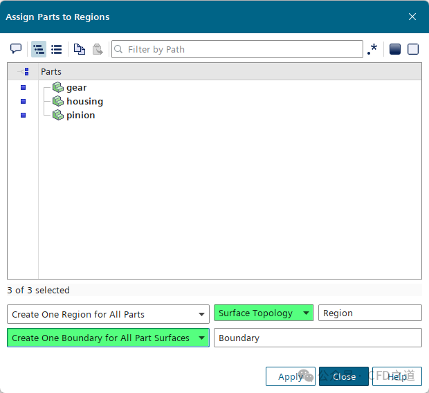 在 Assign Parts to Regions 对话框中,设置以下选项,点击 Apply 及 Close 按钮