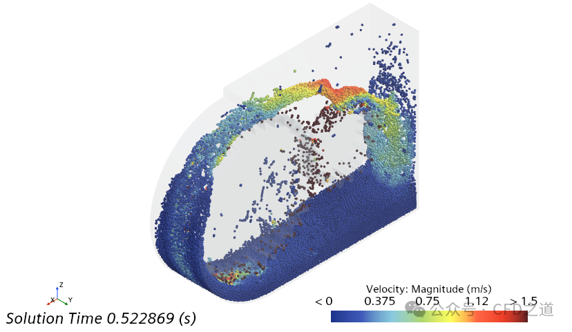 默认情况下,SPH模拟过程中的时间步长会动态调整。在满足Courant-Friedrichs-Lewy (CFL) 稳定性条件的同时,时间步长尽可能地保持最大。该模拟运行的物理时间为0.5秒。