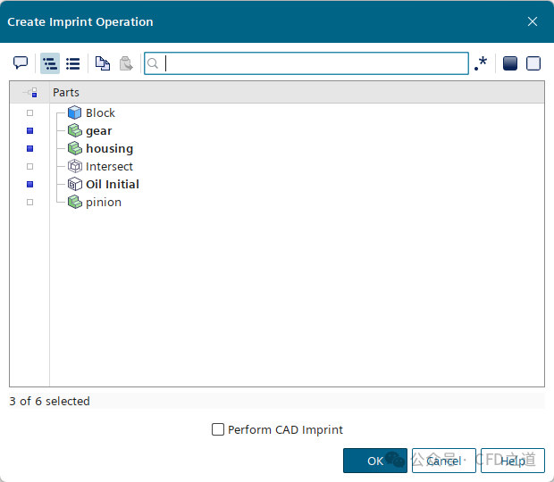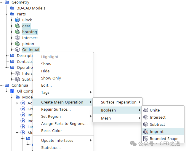 多选 Parts 节点下的housing,gear,和 Oil Initial 节点,右键单击其中一个选定的节点,并选择 Create Mesh Operation > Boolean > Imprint。
