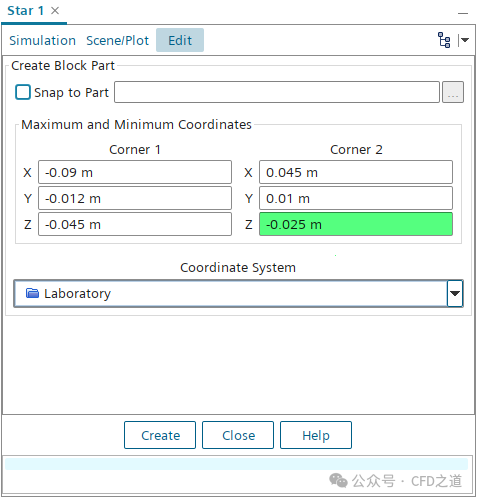 在 Create Block Part 对话框中,在 Maximum and Minimum Coordinates 组框中,对于 Corner 2,将 Z 设置为 -0.025 m,然后点击 Create 和 Close。
