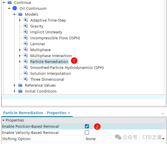 选择 Continua > Oil Continuum > Models > Particle Remediation 节点并激活 Enable Position-Based Removal。