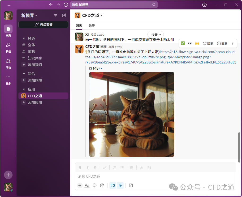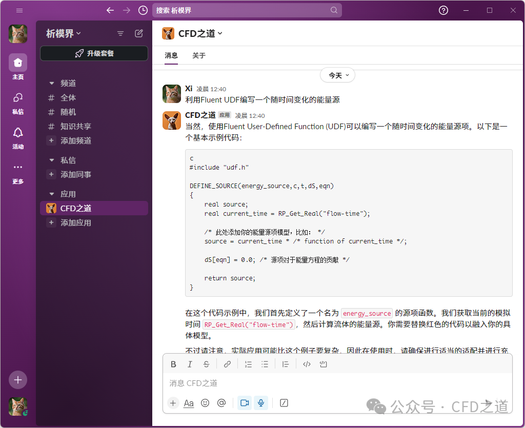 前面说到将Coze发布到Discord平台(见搞了个CFD问答机器人),各位道友可以自行使用。不过Discord访问起来较为麻烦,后来我发现国内可以访问到Slack,而Coze是支持创建Slack机器人的,然后按照官方提供的配置方法将Coze发布到了Slack,终于可以实现在国内访问了。