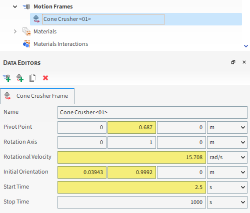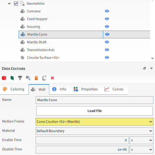 选中模型树节点 Geometries > Mantle Cone,指定其Motion Frame为 Cone Crusher<01>(Mantle)