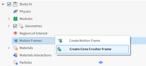 右键单击节点 Motion Frames,点击菜单项``Create Cone Crusher Frame`创建新节点