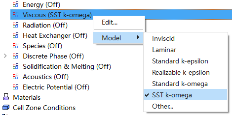 右键选择模型树节点Models > Viscous,选择弹出菜单项Model → SST k-omega采用SST k-omega湍流模型