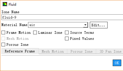 双击模型树节点Cell Zone Conditions > fluid > fluid-9,弹出对话框中确保Material Name为air