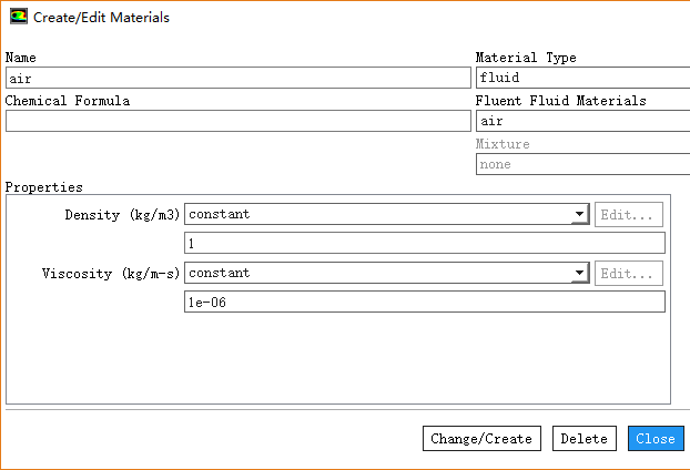 鼠标双击模型树节点Materials > Fluid > air,如下图所示设置其密度及粘度分别为1 kg/m3及1e-6 kg/m-s