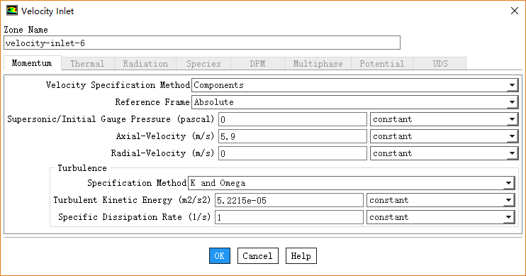 双击模型树节点Boudnary Conditions > velocity-inlet-6,如下图所示,设置Velocity Magnitude为5.9 m/s,设置湍动能及湍流耗散率