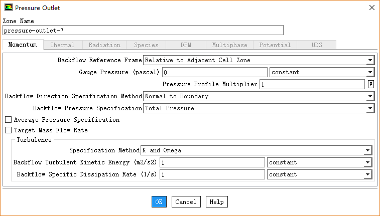 鼠标双击模型树节点Boundary Conditions > pressure-outlet-3,如下图所示设置参数