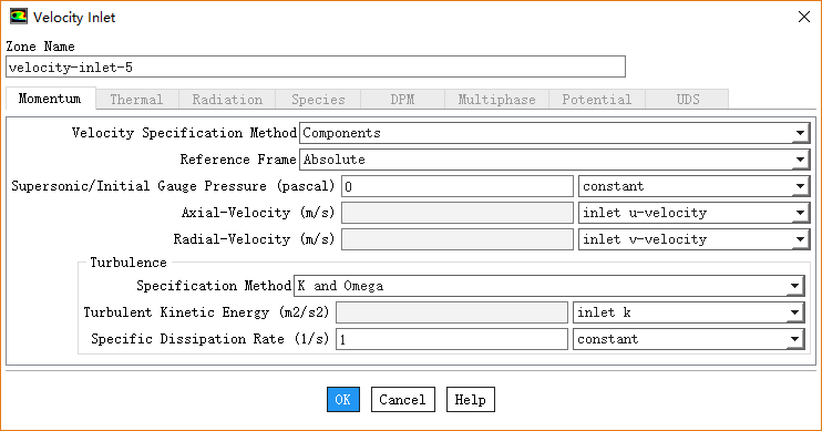 双击模型树节点Boudnary Conditions > velocity-inlet-5,如下图所示,设置Velocity Magnitude为5.9 m/s**,设置湍动能及湍流耗散率