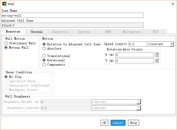 双击模型树节点Boudnary Conditions > moving-wall,如下图所示,设置其旋转速度为0.5 rad/s