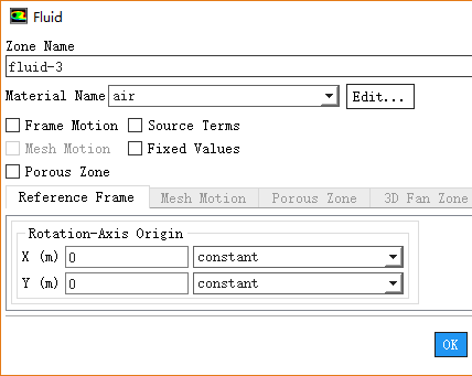 双击模型树节点Cell Zone Conditions > fluid > fluid-3,弹出对话框中确保Material Name为air