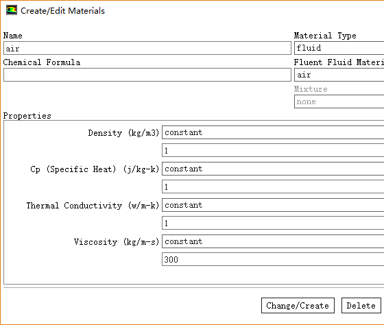 鼠标双击模型树节点Materials > Fluid > air,如下图所示设置其物性参数