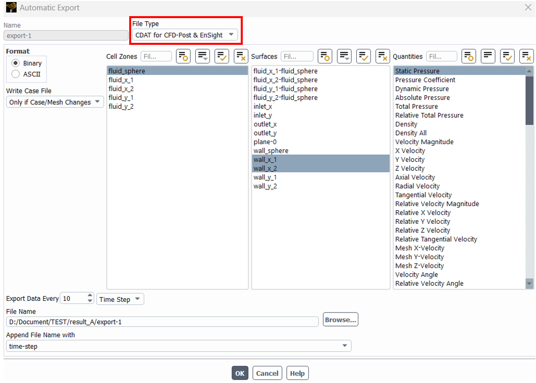 CDAT 文件可仅保存特定区域的部分物理量数据。如上图所示,CDAT 文件中仅保存流体域“fluid_sphere”和固体表面“wall_x_1”、“wall_x_2”的压力值。