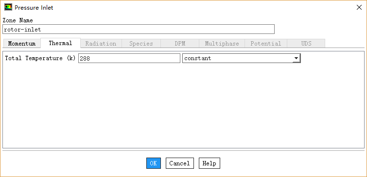 切换到Thermal标签页,设置Total Temperature为288 k