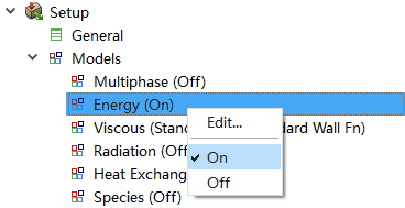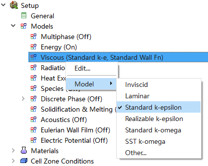 右键选择模型树节点Model > Viscous,点击弹出菜单项Model → Standard k-epsilon开启湍流模型