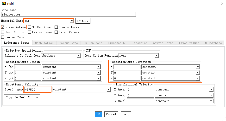 设置Rotational Velocity为-37500 rpm,设置Rotation-Axis Direction为X轴方向,如下图所示
