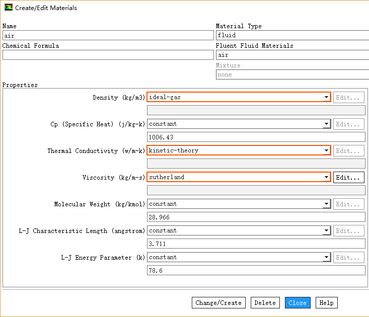鼠标双击模型树节点Materials > Fluid > air,弹出材料属性设置对话框,如下图所示进行设置