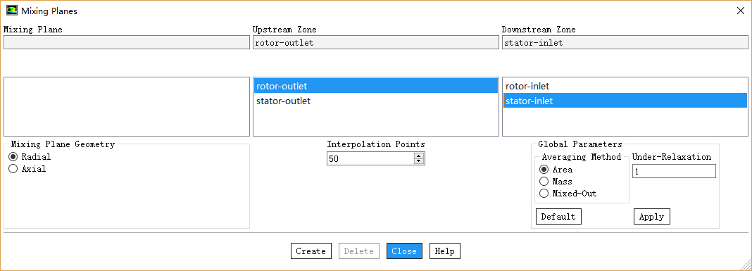 如下图所示选择Upstream Zone为rotor-outlet,选择Downstream Zone为stator-inlet,其他参数保持默认设置,点击按钮Create创建混合平面