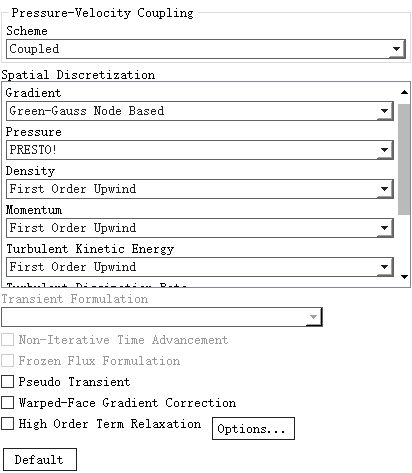 鼠标双击模型树节点Methods,如下图所示,右侧面板设置压力速度耦合算法为Coupled