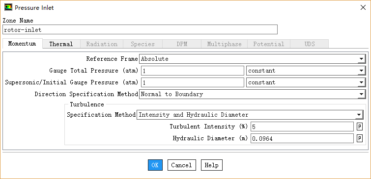 鼠标双击模型树节点Boundary Conditions > rotor-inlet,弹出边界设置对话框,如下图所示,设置Gauge Total Pressure为1 atm,设置湍流强度为5%,设置水力直径为0.0964 m