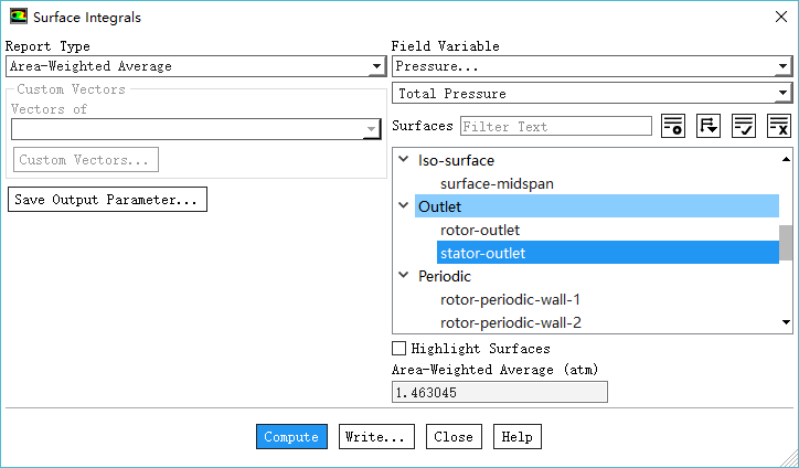 鼠标双击模型树节点Results > Reports >Surface Integrals,弹出设置对话框,如下图所示,计算出口总压为1.463045 atm