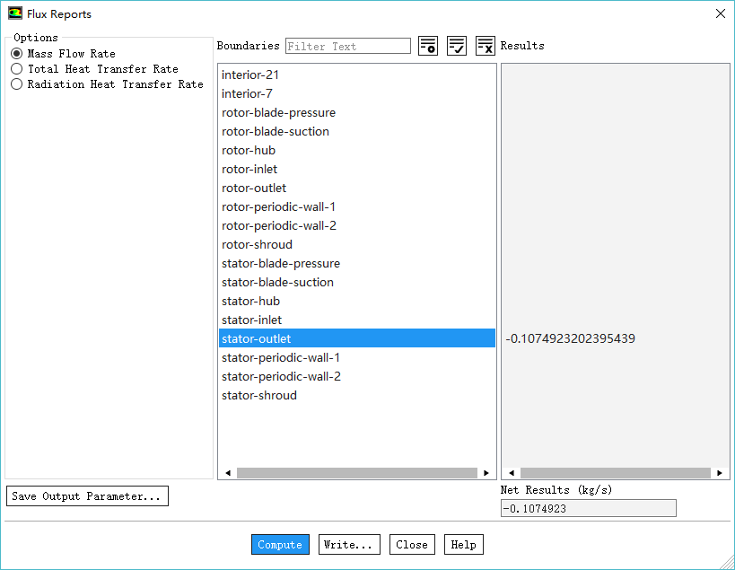 鼠标双击模型树节点Results > Reports > Fluxes,弹出设置对话框,如下图所示,计算出口流量为0.1074923 kg/s