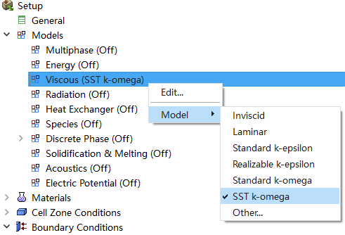 右键选择模型树节点Models > Viscous,点击弹出菜单项Model → SST k-omega启用SST k-w模型