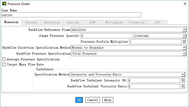 鼠标双击模型树节点Boundary Conditions > outlet,保持默认设置