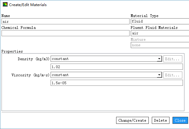 双击模型树节点Materials > fluid > air弹出材料参数设置对话框,设置密度为1.02 kg/m3,粘度为1.5e-5 kg/m-s